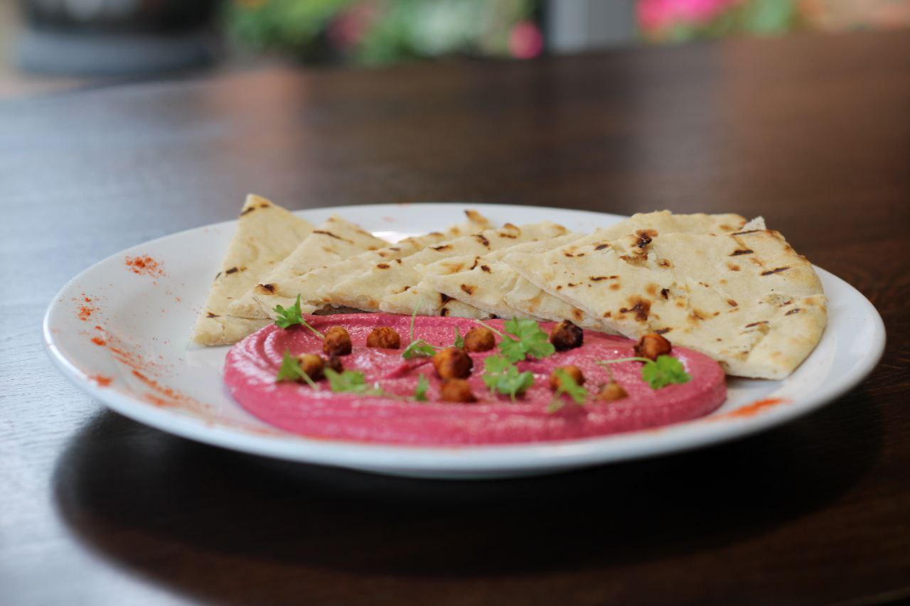(Roasted beetroot blended with chickpeas and tahini, served with warm flatbread.)