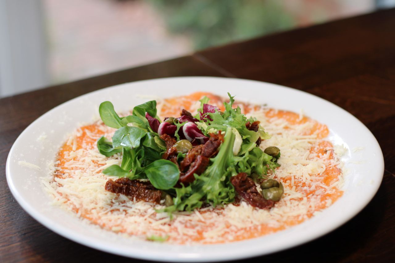 (Cured salmon with salad mix, capers, and sun-dried tomatoes, dressed with lemon and olive oil, topped with parmesan. Served with mini French baguettes.)