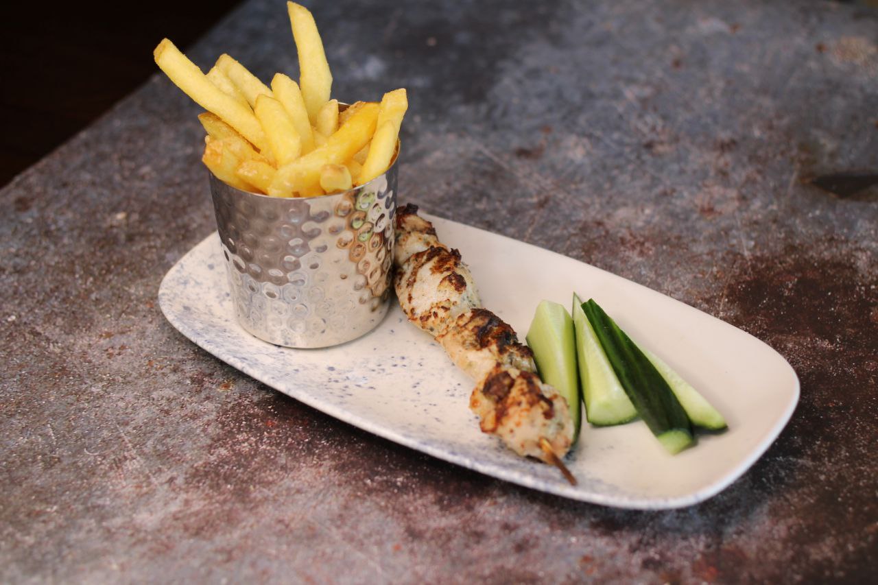 Kid’s Chicken breast skewer with skinny fries and sliced cucumber ( D )