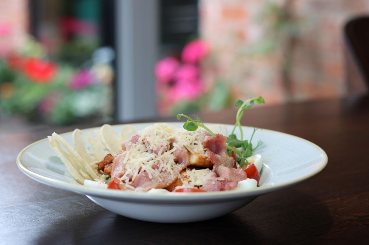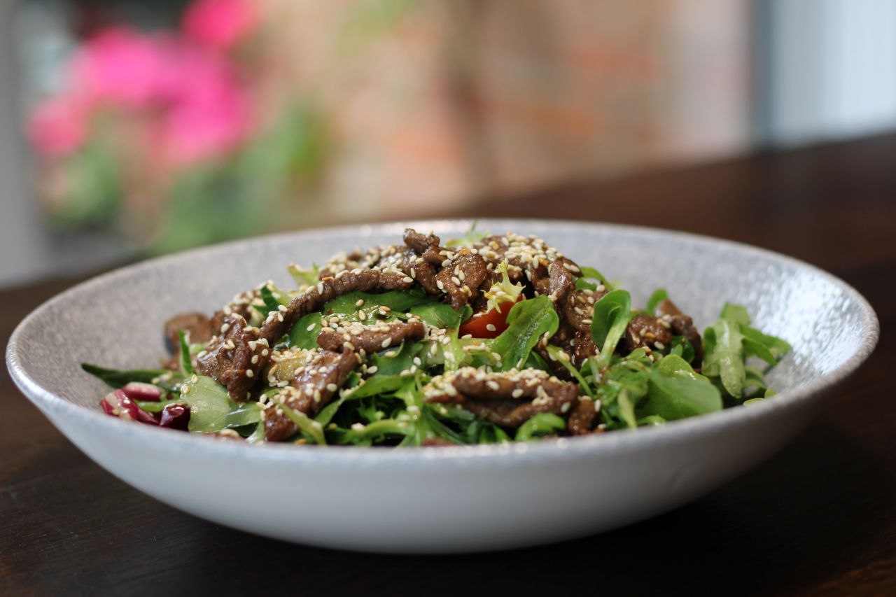 (Warm beef, salad leaves, rocket, cherry tomatoes, cucumber, sesame seeds, dressed with garlic, soy, Worcestershire & olive oil.)