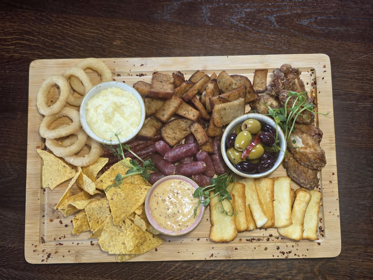 (Chicken wings (6each), kabanos sausage, Sticky Pork Bites with JD sauce, deep-fried bread, onion rings, halloumi, nachos, antipasti olives mix, homemade mustard sauce & garlic cheese mayo dip.)