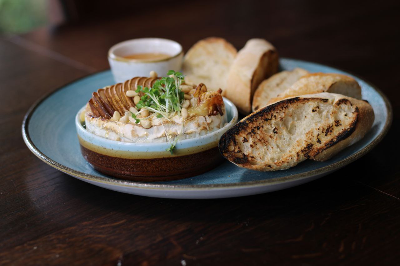 (Baked Camembert with roasted pear, pine nuts and honey. Served with mini French baguettes.)